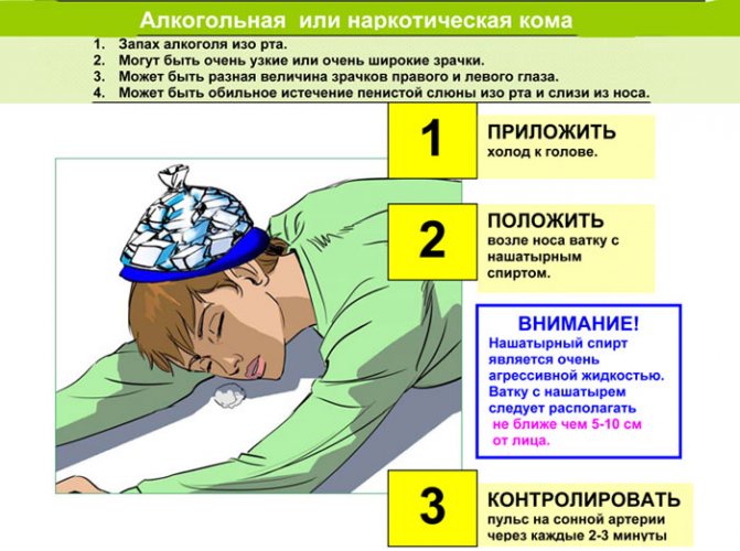 Алкогольную кому нужно отличать от уремического состояния, отравления дериватами, морфинами. Запах алкоголя изо рта не способствует сочетанному поражению. Нарушение мозгового кровоснабжения сопровождается параличом половины туловища с отклонением в сторону нистагма.