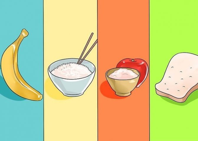 Отварной белый рис, который принимается по 50-100 г раз в два часа с рисовым отваром. Бананы, пополняющие запасы калия и скрепляющие, по два банана каждые четыре часа. Жидкие каши на воде из манки, риска, овсянки или гречки. Сухарики из белого хлеба. Паровой омлет или яйцо всмятку, протертый творог на следующий день после поноса. Запеченные, отварные протертые в пюре яблоки или морковь. Слизистые супы на неконцентрированном курином бульоне с фрикадельками. Филе постной рыбы или постное мясо без кожи и костей или котлеты на пару. Овощные пюре или отвары. Кисели с грушей, черникой, айвой, черемухой. Зеленый чай, травяные настои.