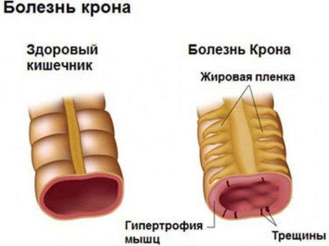 Болезнь Крона более характерна для мужского организма. Это аутоиммунное заболевание, которое может начаться после 15 лет. Характерно повреждение слизистой повздошной кишки, которое вызывает вялость, нарушения стула, периодические приступы аппендицита, рвоту, вздутие живота и боли в околопупочной области. Характерна потеря веса и отсутствие аппетита. Лечение симптоматическое, так как аутоиммунные процессы еще не научились лечить.