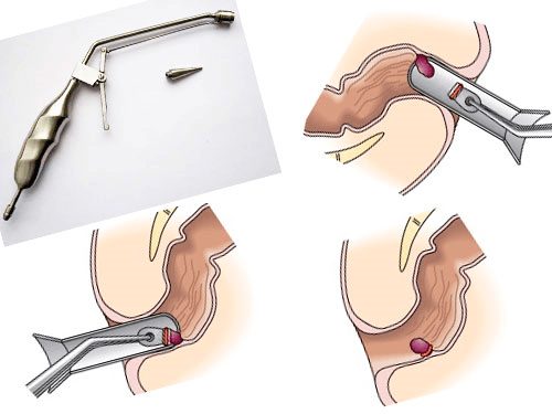 - Латексный. Латексное кольцо одевают на место соединения шишки с тканями при помощи аноскопа. Кольцо передавливает основание шишки, она отсыхает и выводится с калом.