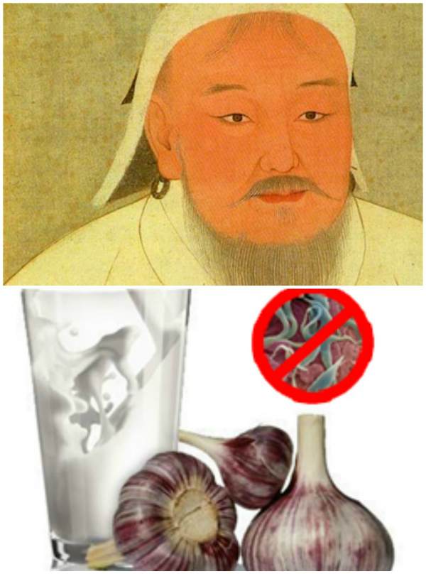 Метод Чингисхана подразумевает избавление от паразитов с помощью чеснока. Для этого ежедневно автор советует мелко нарезать и съедать по 1 головке чеснока. Запивать его можно любым натуральным кислым соком или кефиром.